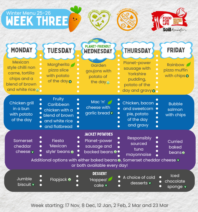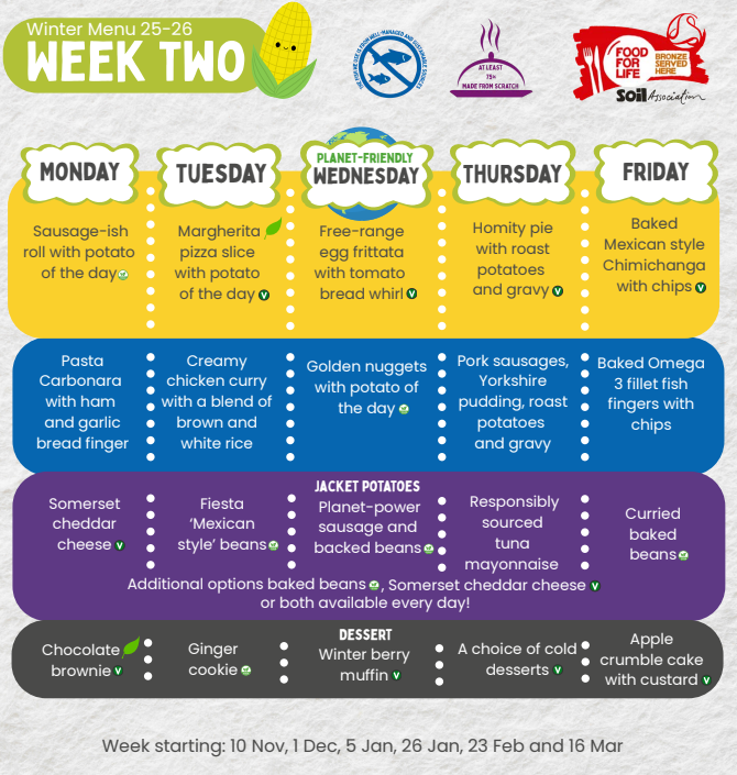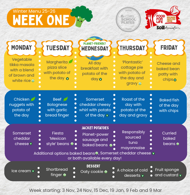 Meals are listed as Vegetarian or Vegan when the main dish is suitable for those diets. Each week also features a meat-free day as part of our support for reducing meat-consumption.